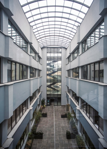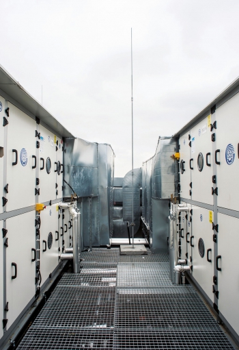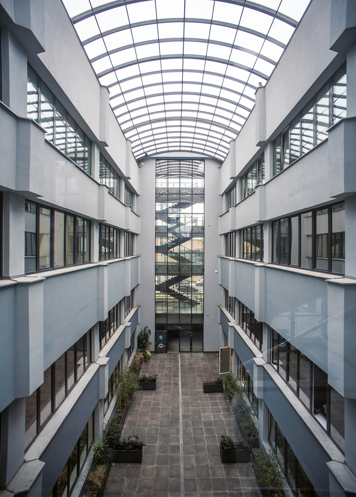 El Centro de Servicios Médicos Especializados de Poznań, conocido en la región como POSUM, se ha dotado, en el marco de una profunda modernización, de un moderno sistema de ventilación basado en las centrales MCKS y las centrales higiénicas MCKH fabricadas por Klimor, con una capacidad total de 48 000 m3/h. Actualmente, el centro cuenta con modernas consultas especializadas, un laboratorio y un quirófano, en el que la ventilación de la mesa de operaciones se realiza mediante un techo laminar NSL con filtros HEPA 13. El sistema de ventilación de este edificio se ha integrado en un sistema de bombas de calor alimentado por una fuente subterránea, que consta de más de 60 perforaciones de más de 100 m de profundidad.
