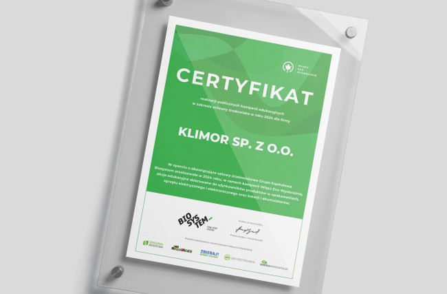 La empresa Klimor ha obtenido el certificado de realización de campañas educativas públicas en materia de protección del medio ambiente en 2024. Este reconocimiento confirma nuestro compromiso sistemático con las actividades ecológicas.