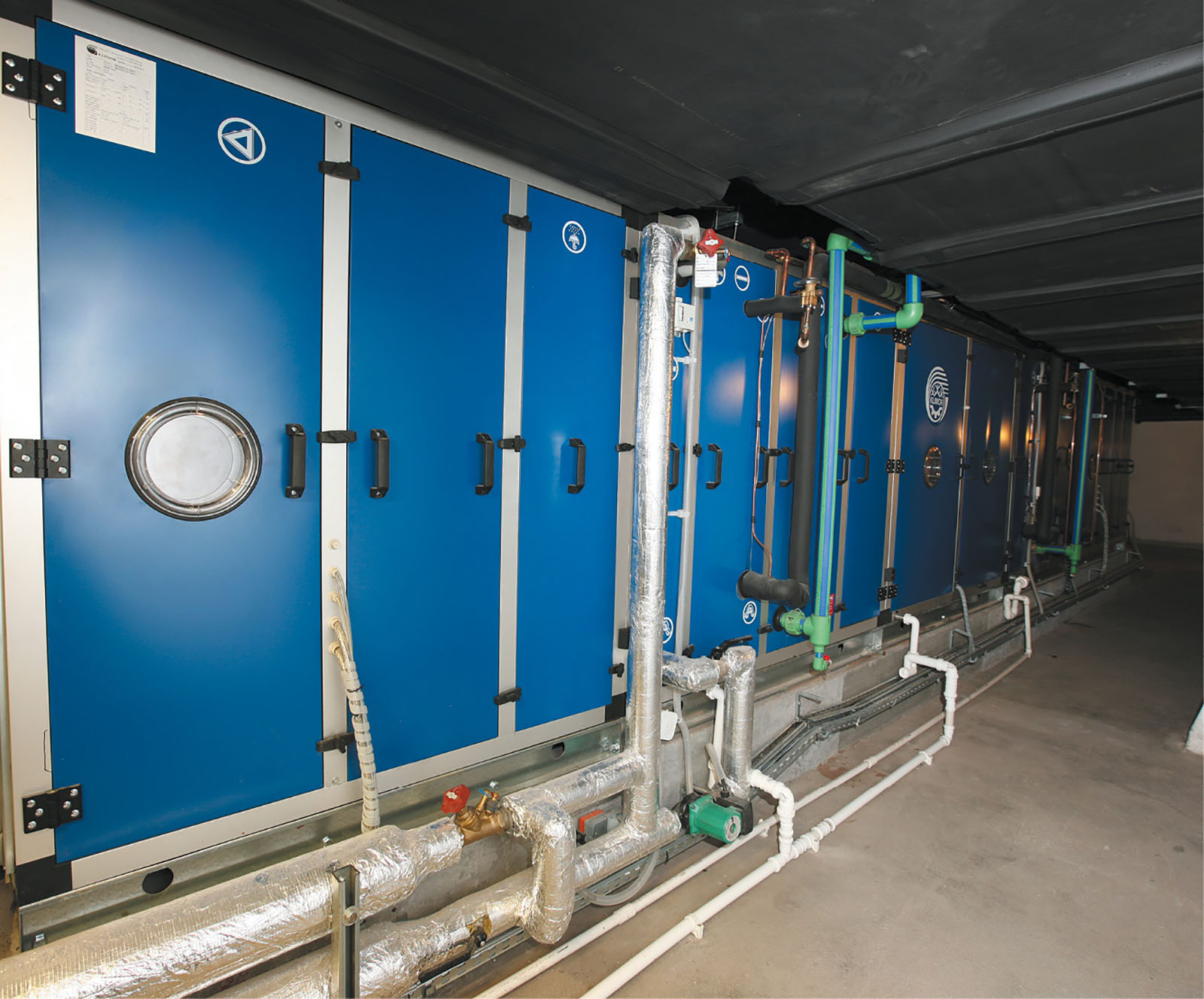El proyecto de instalación incluyó una central de ventilación de suministro y extracción de aire para piscinas MCKB con recuperación de calor por glicol y una bomba de calor reversible con un caudal de aire de suministro y extracción de 18 000 m3/h (500 Pa), y dos centrales de ventilación suspendidas PCKb con un caudal de 1212 m³/h y 1120 m³/h, destinadas a la ventilación de ambos vestuarios.